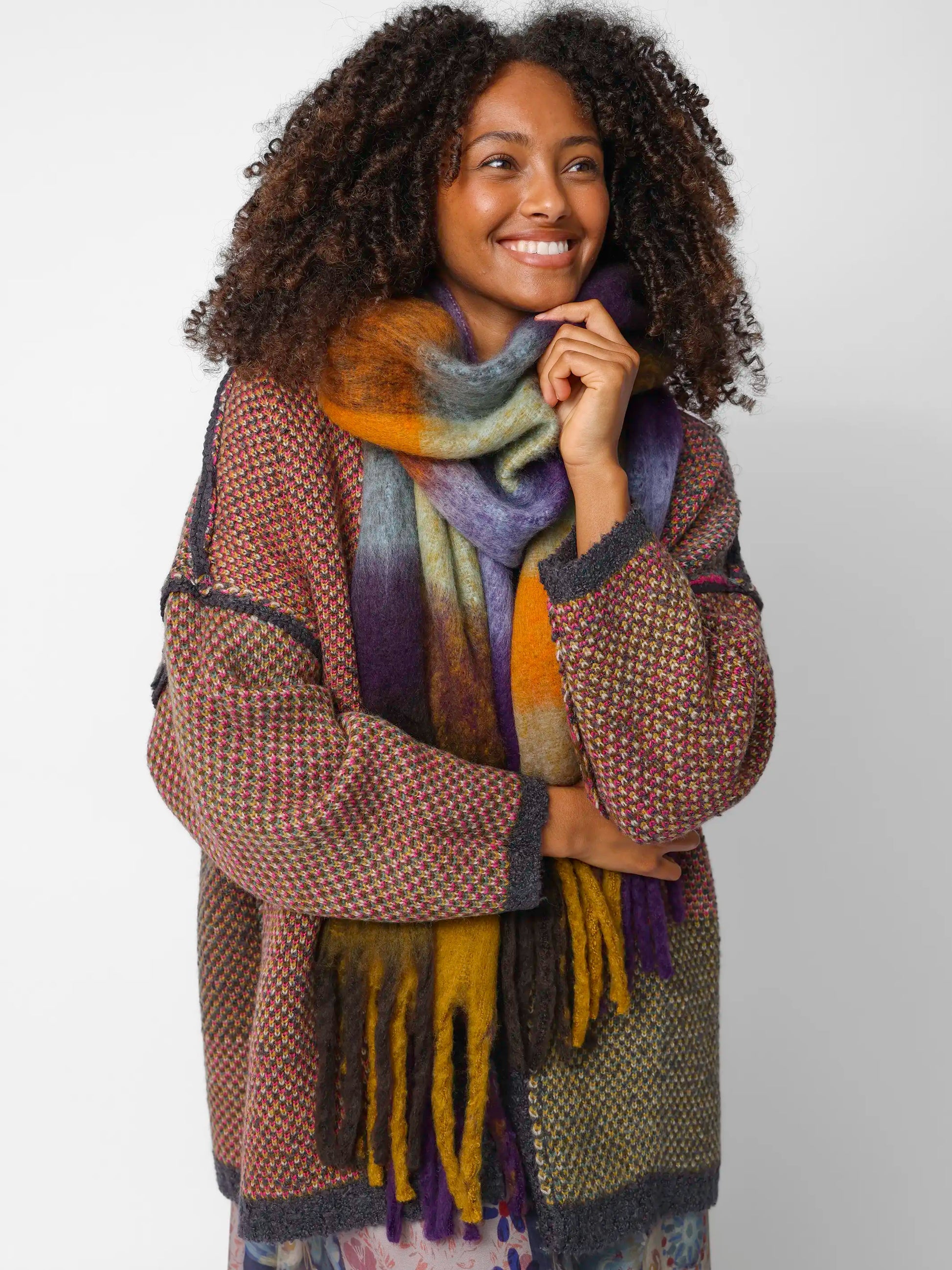 It's made from the softest. fluffy yarn in the most beautiful colors. It's perfect for bundling up on chilly days or adding a pop of joy to any winter outfit.