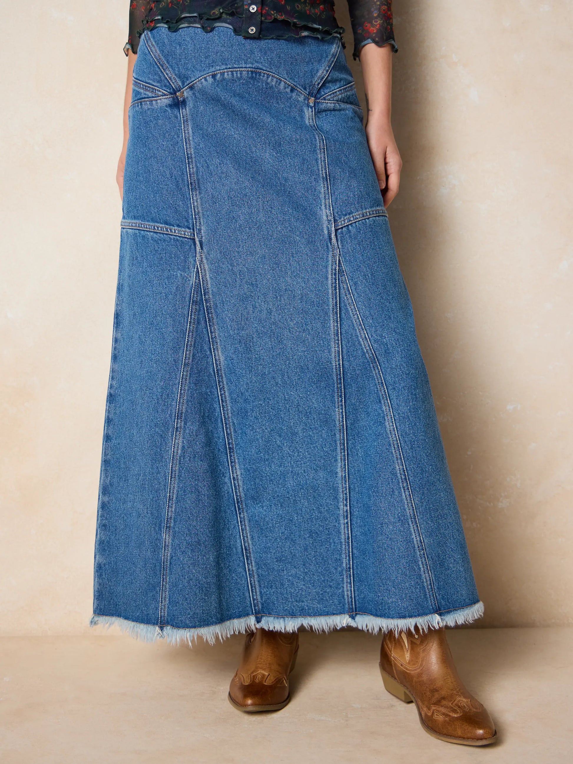 Fitted Cotton Denim Maxi Skirt - Medium Wash
