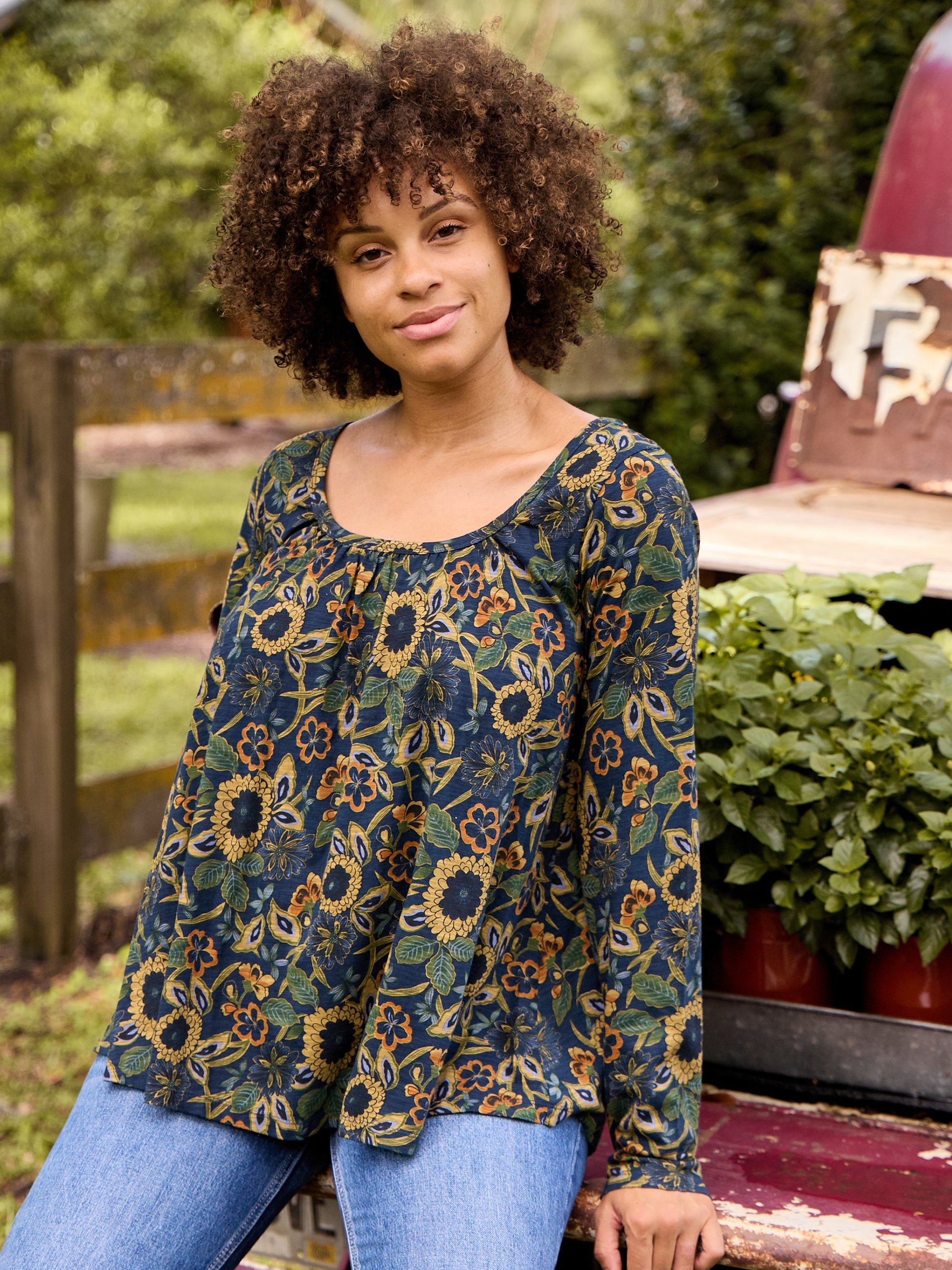 Iris Cotton Top - Navy Tan Dahlias