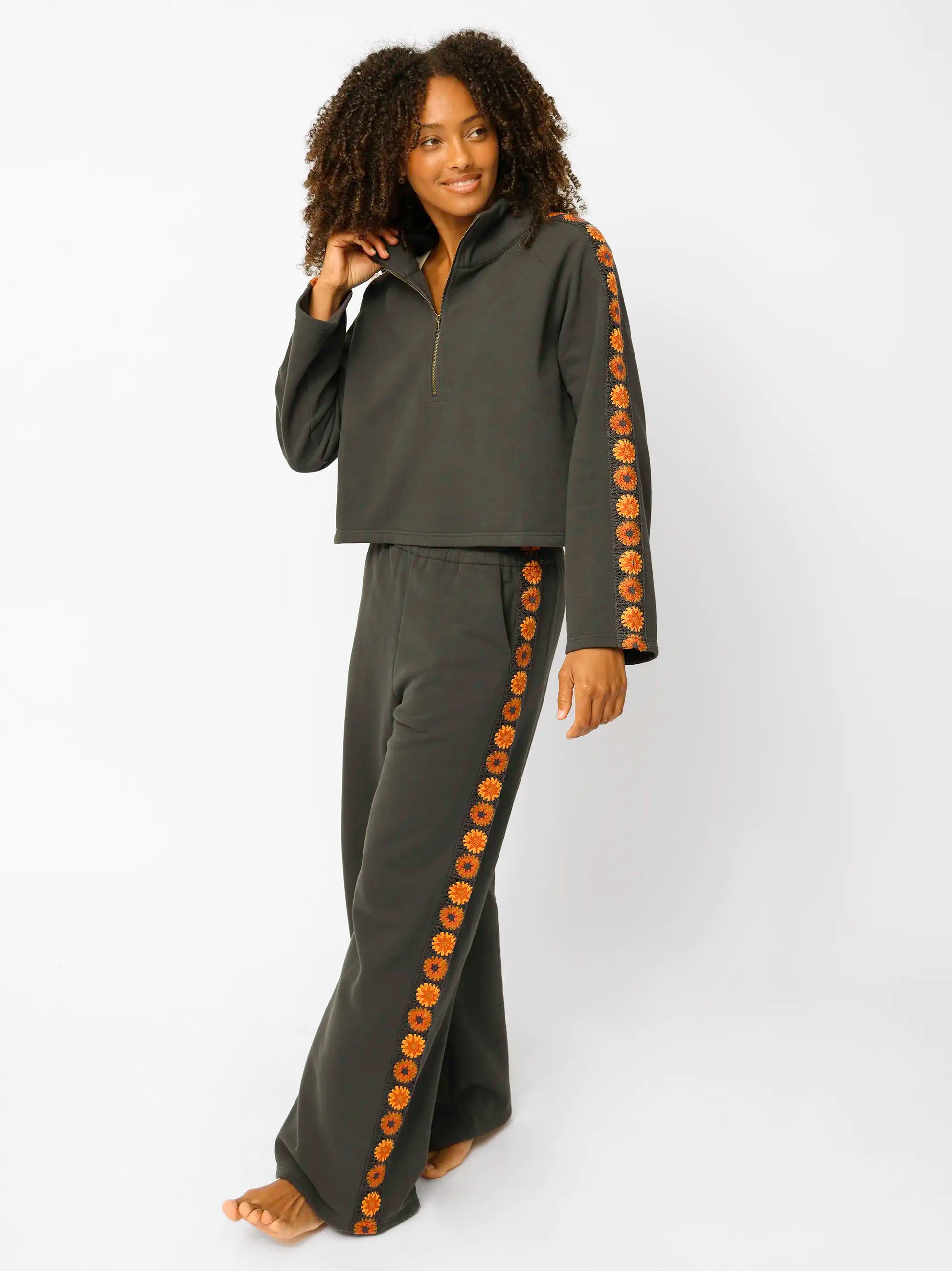 It's so comfy & boho! Love the crochet trim trim running down each sleeve. Pair it with the matching pants for the ultimate cozy-cute set.