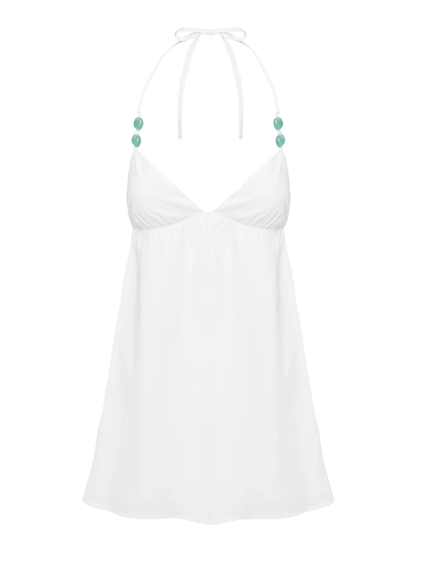 - Bead detail. v neckline. ruched bust. adjustable halter straps. low back design