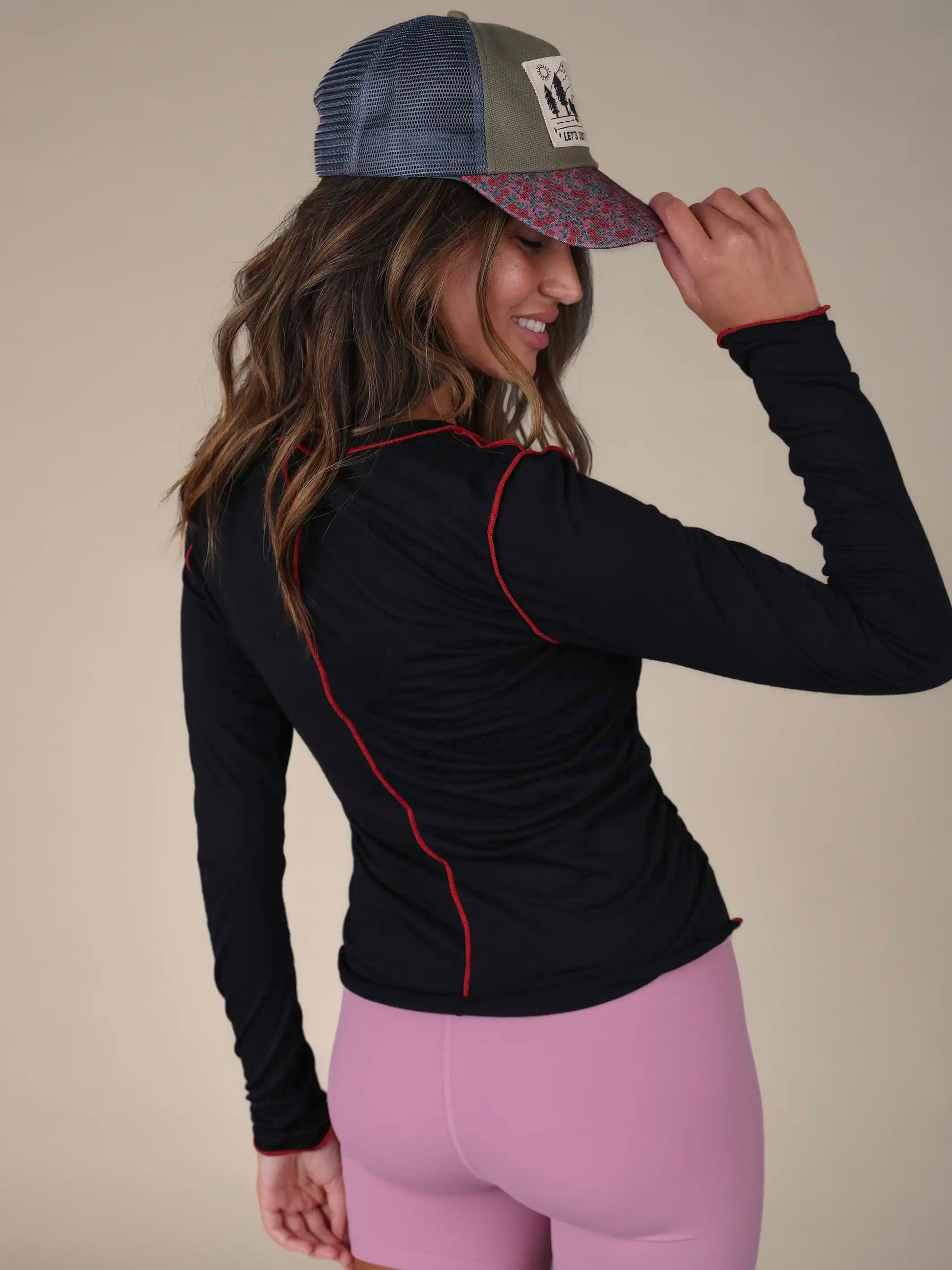 The ruched sides and contrast stitching! And it's so comfy!
