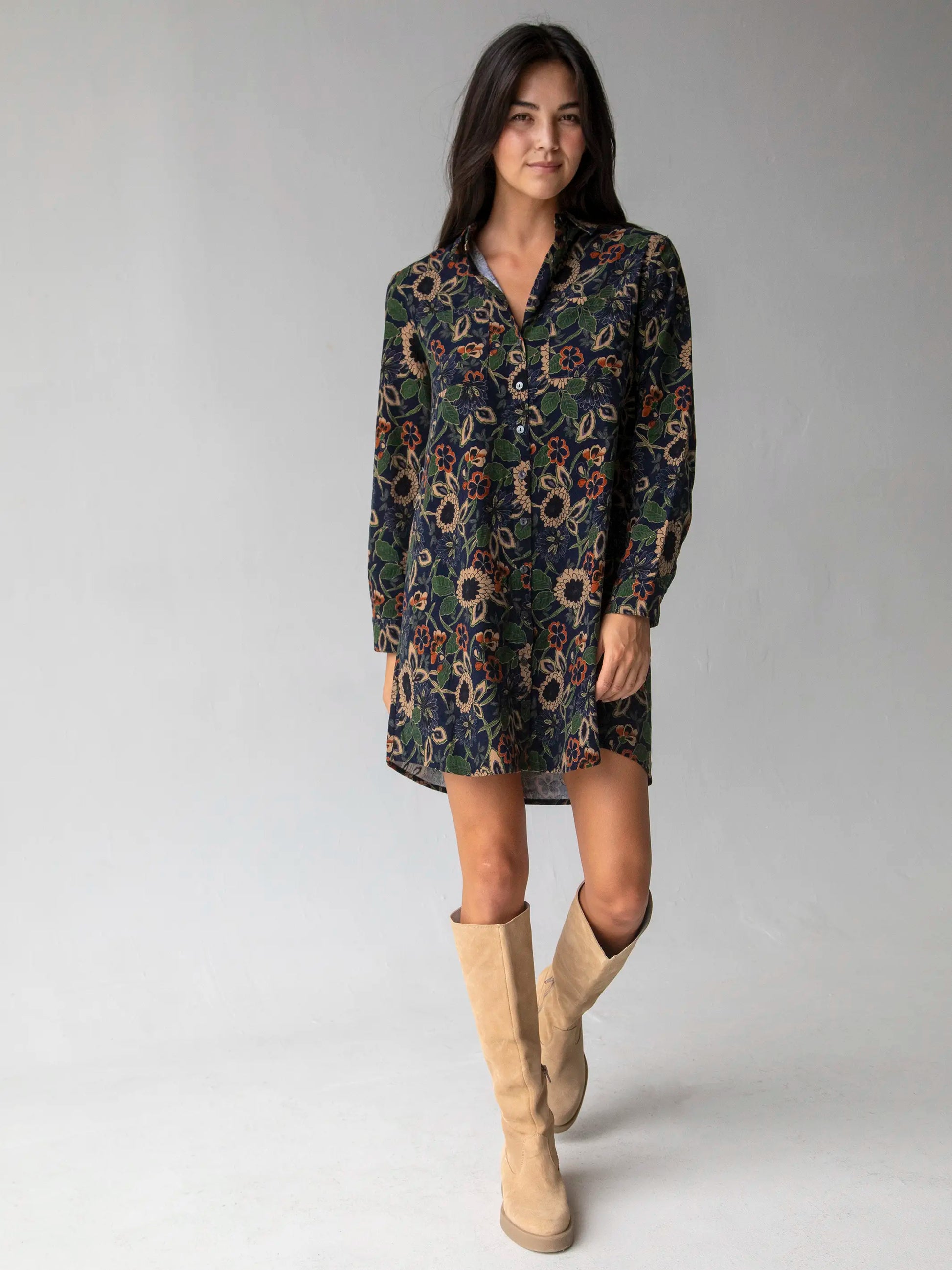Rocky Corduroy Dress - Navy Tan Dahlias